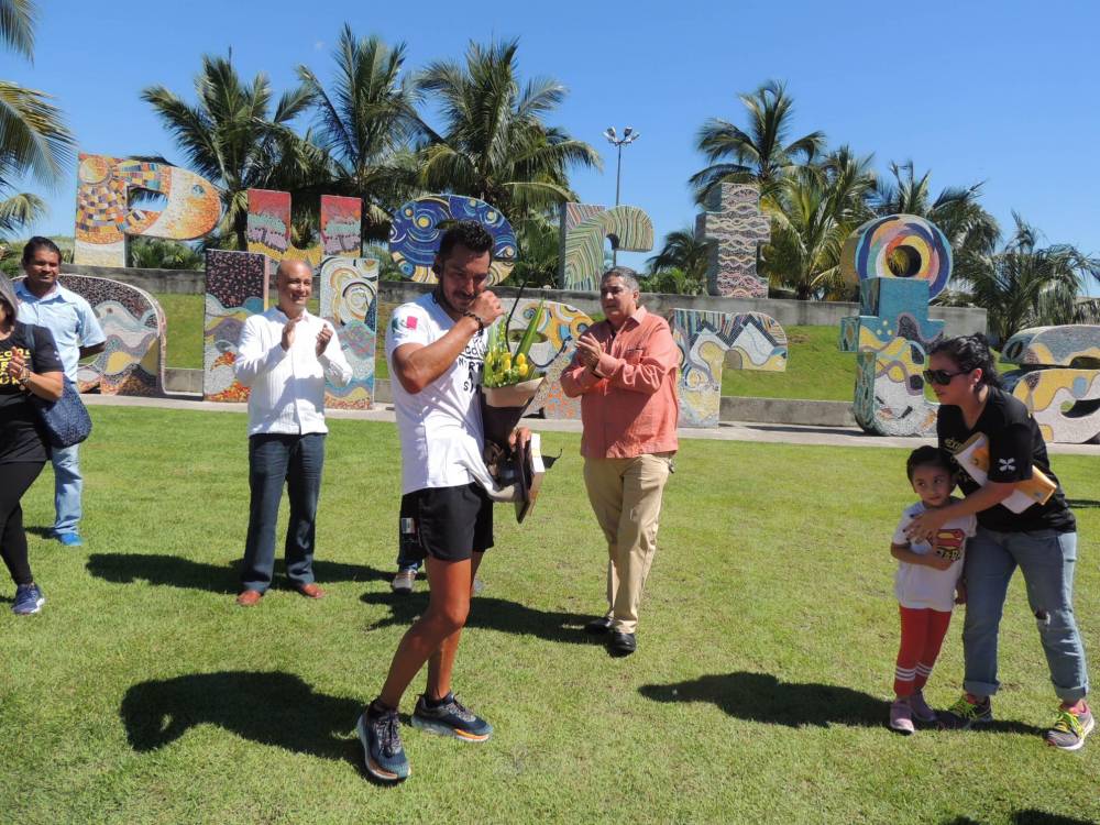 El atleta mexicano Daniel Almanza llegó a su meta ubicada en el crucero de Las Juntas, puerta de entrada al municipio vallartense, con exactitud en las letras de “Puerto Vallarta”, alrededor de las 12:50 de la tarde. El maratonista fue recibido por el director regional de turismo Ludwig Estrada Virgen, el regidor Saúl López Orozco preside la Comisión de Deportes, y prensa local.