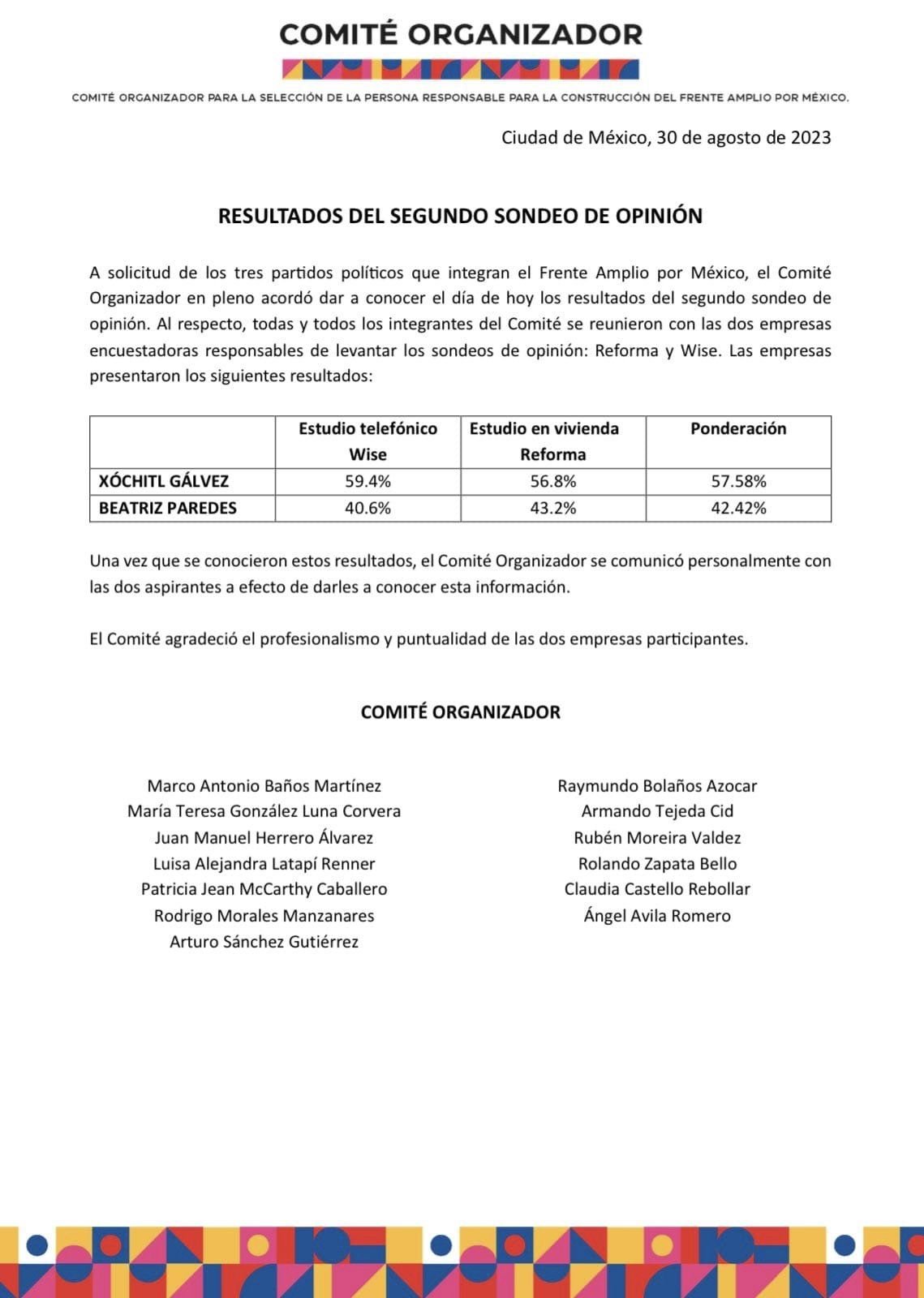 Ayer por la tarde, el Comité Organizador del Frente Amplio de México adelantó los resultados de sus encuestas donde los números favorecen a la senadora Xochitl Gálvez quien en los próximos días será nombrada como la candidata del Frente que conforman los partidos del PAN, PRI y PRD.