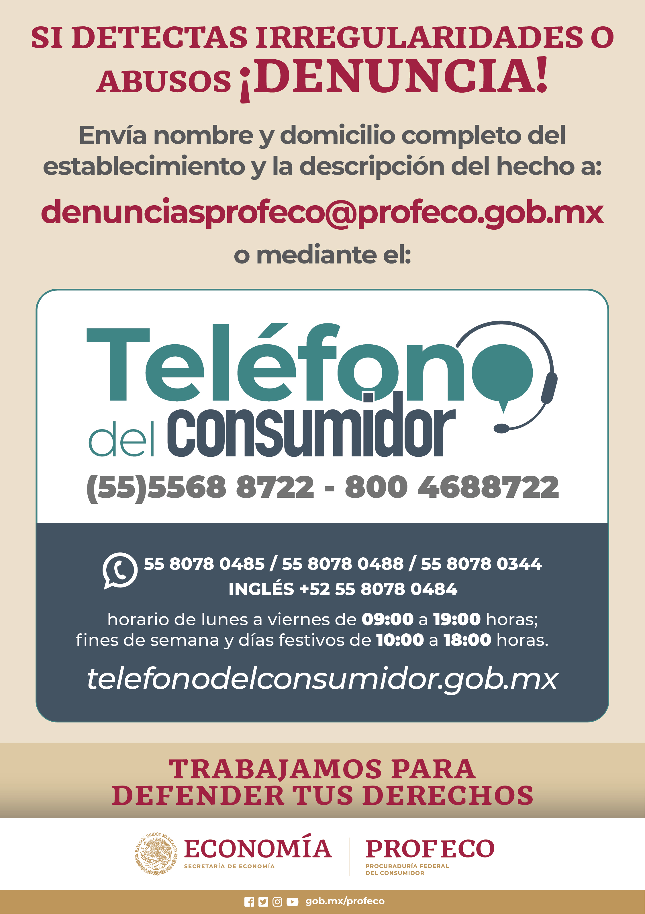 Se hace un llamado a denunciar abusos a través del Teléfono del Consumidor 55 5568 8722 y del correo electrónico denunciasprofeco@profeco.gob.mx
