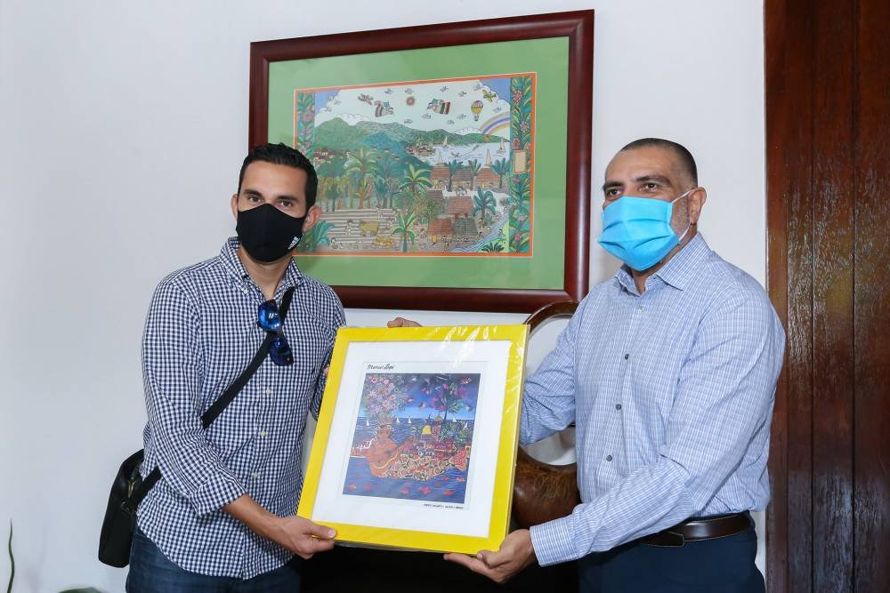 Acompañado por el director del Consejo Municipal del Deporte (Comude), José Amador Hernández Madrigal y el coordinador de Gabinete, Víctor Bernal Vargas, el alcalde vallartense hizo entrega de una litografía del pintor Manuel Lepe. Por su parte, César Ramos hizo entrega de unas tarjetas que utilizó en el mundial de Rusia 2018 y un llavero.