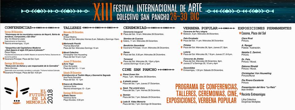 Bajo el lema «El futuro en la memoria», del 26 al 30 de diciembre se lleva a cabo la versión número 13 del Festival Internacional de Arte Colectivo San Pancho 2018, uno de los eventos emblemáticos de la Capital Cultural de Riviera Nayarit.